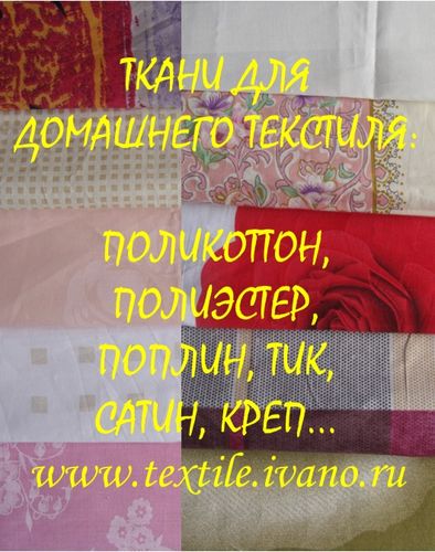 Ткани отбеленные, гладкокрашенные, набивные, жаккардовые: → тик набивной; → бязь отбеленная, бязь гл.кр., поплин отбеленный; → поликоттон отбеленный, поликоттон жаккардовый; → мадаполам, ситец гл.кр., вафельное полотно; → страйп-сатин